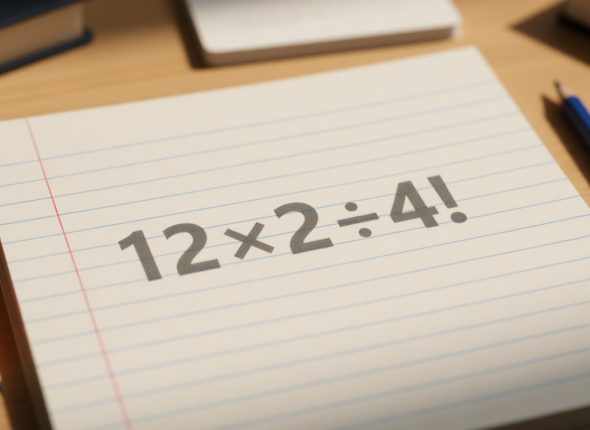 Взрослый глаз цепляется за знакомую четвёрку, а восклицательный знак воспринимается как просто восклицание. В результате получается 12 × 2 = 24, 24 ÷ 4 = 6. Ответ 6 — но он неверный. Пример специально составлен так, чтобы проверить, помните ли вы определение факториала.