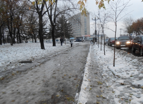 Прошедший 24 октября сильный снегопад и сегодняшние осадки дали о себе знать. Снег, который не успел растаять после выходных, превратился в ледяную корку. Таким метаморфозам способствовал дождь и +1 градус.