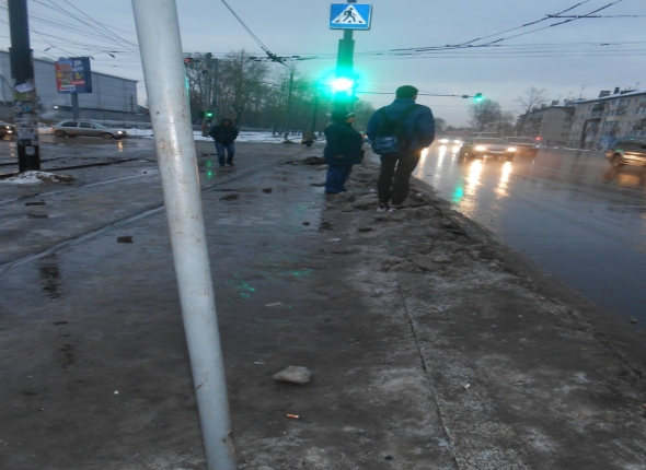 К слову, то же самое происходит с противоположной стороны – там опасность возникла из-за недоделанной работы с демонтажем подземного перехода. Горожане проходят по ледяному тротуару вдоль ям от перехода, которые огорожены только лентой.