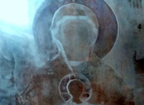 Заметили это совершенно случайно: в храме решили почистить стекло с внутренней стороны нескольких икон. Когда сняли стекло с иконы "Неупиваемая Чаша", то было ощущение, что оно как бы "пыльное", но "пыль" эта не стирается. Решили посмотреть на свет и – обомлели: на стекле проявился образ Богоматери, словно негатив.