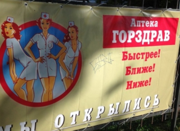 Рекламный баннер аптеки "Горздрав" с изображением трех изогнувшихся медсестер в коротких халатиках и двусмысленной подписью рядом вызвал негодование не только случайных прохожих, но и многих завсегдатаев Всемирной паутины, сообщает корр. ИА AmurMedia.