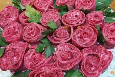 Селёдка под шубой по-новому: необычный вариант новогодней классики с розами из блинов